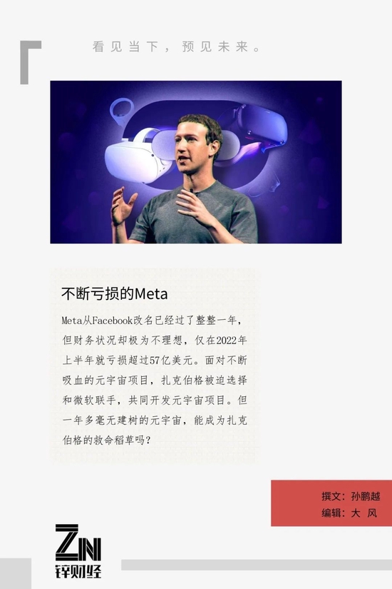 但元宇宙却没有给扎克伯格足够的回报,据财报显示:Meta的元宇宙部门在2019年、2020年、2021年亏损分别为45亿美元、66亿美元和102亿美元;而2022年亏损更加严重,仅上半年就已亏损了超过57亿美元。